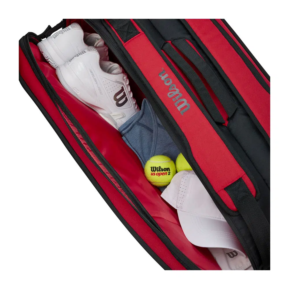 Schitterende nieuwe racketbag van Wilson in de kleur rood met zwarte accenten. In deze exclusieve grote tennistas neemt u al uw spullen mee naar de tennisbaan inclusief extra schoeisel en kleding.
